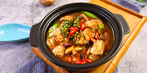 經(jīng)過(guò)數(shù)十種香料和名貴藥材的秘制醬料精心烹飪而成,用土制燒制而成,雞塊在砂鍋內(nèi)沸騰...